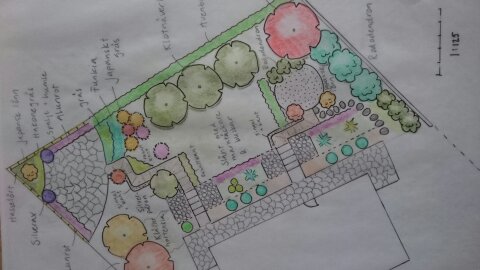 Vi tar oss an hela eller den del av din trädgård du önskar och bollar idéer. Du får förslag till utformning av hårdgjorda ytor och planteringar. Vi kan skissa upp en plan som visar en övergripande utformning av trädgården i form av häckar, avskärmningar, träd, gångar och sittplatser. Idéskissen är ett bra arbetsunderlag för att visa trädgårdens struktur och form men utan växtval och material.